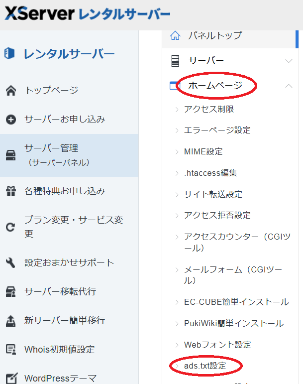 エックスサーバーのサーバーパネルを開き、「ホームページ」→「ads.txt設定」をクリックする