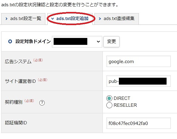 「ads.txt設定追加」タブをクリックし、必要事項を記入する