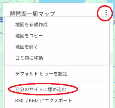 マイマップ編集画面の右上に表示されている3点マークをクリックした後、「自分のサイトに埋め込む」をクリックします。