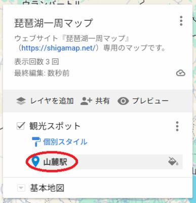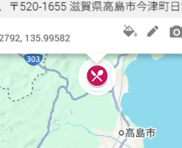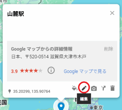 マイマップの特定地点をクリックし、その左下に表示される緯度と軽度を示す数値をコピーします。(例:35.37388, 136.36)。