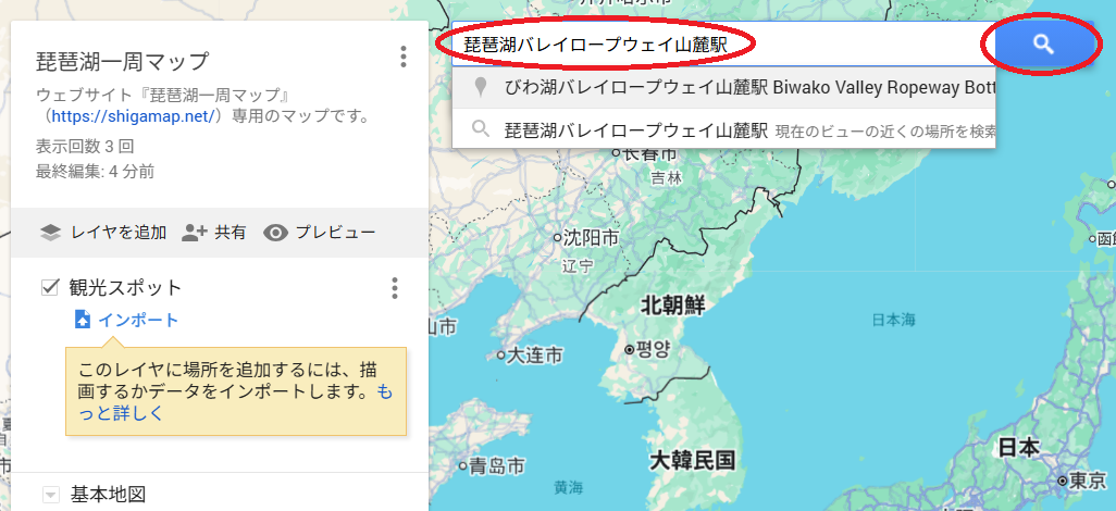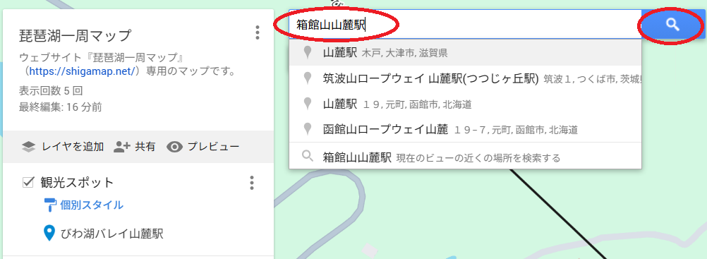 地図で表示させたい地点を検索バーに入力し、検索します。