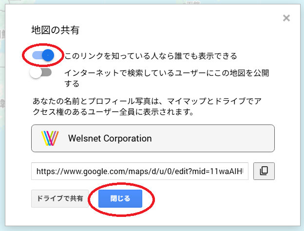 「このリンクを知っている人なら誰でも表示できる」をオンにした後、「閉じる」をクリックする