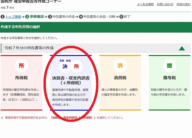 e-Taxで確定申告書の作成方法は、以下のとおりです。