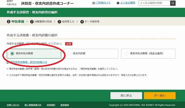 青白申告決算を行う際は、青色決算申告書を選択します。