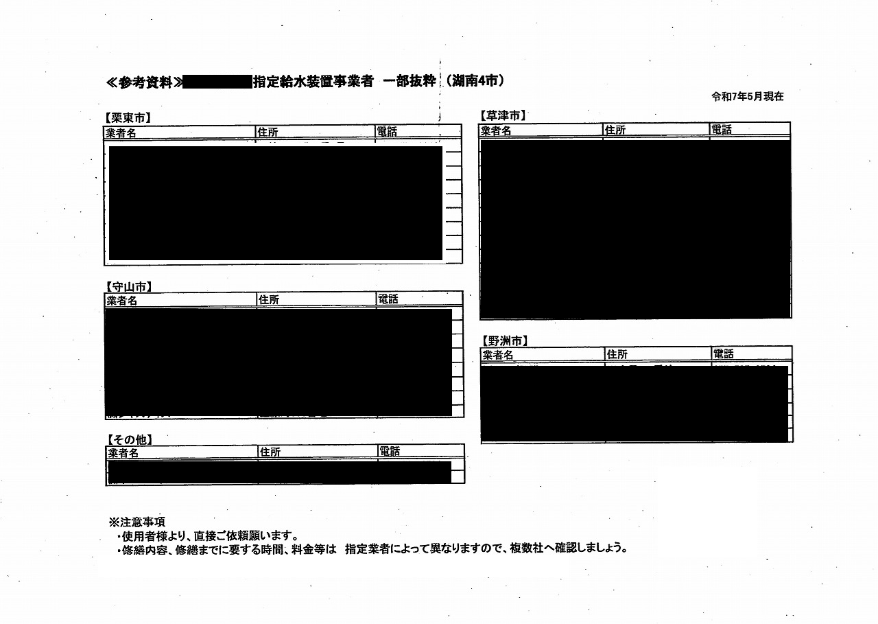 市からいただいた「指定給水装置事業者」の一覧をもとに、家から一番近い業者に相談しました。